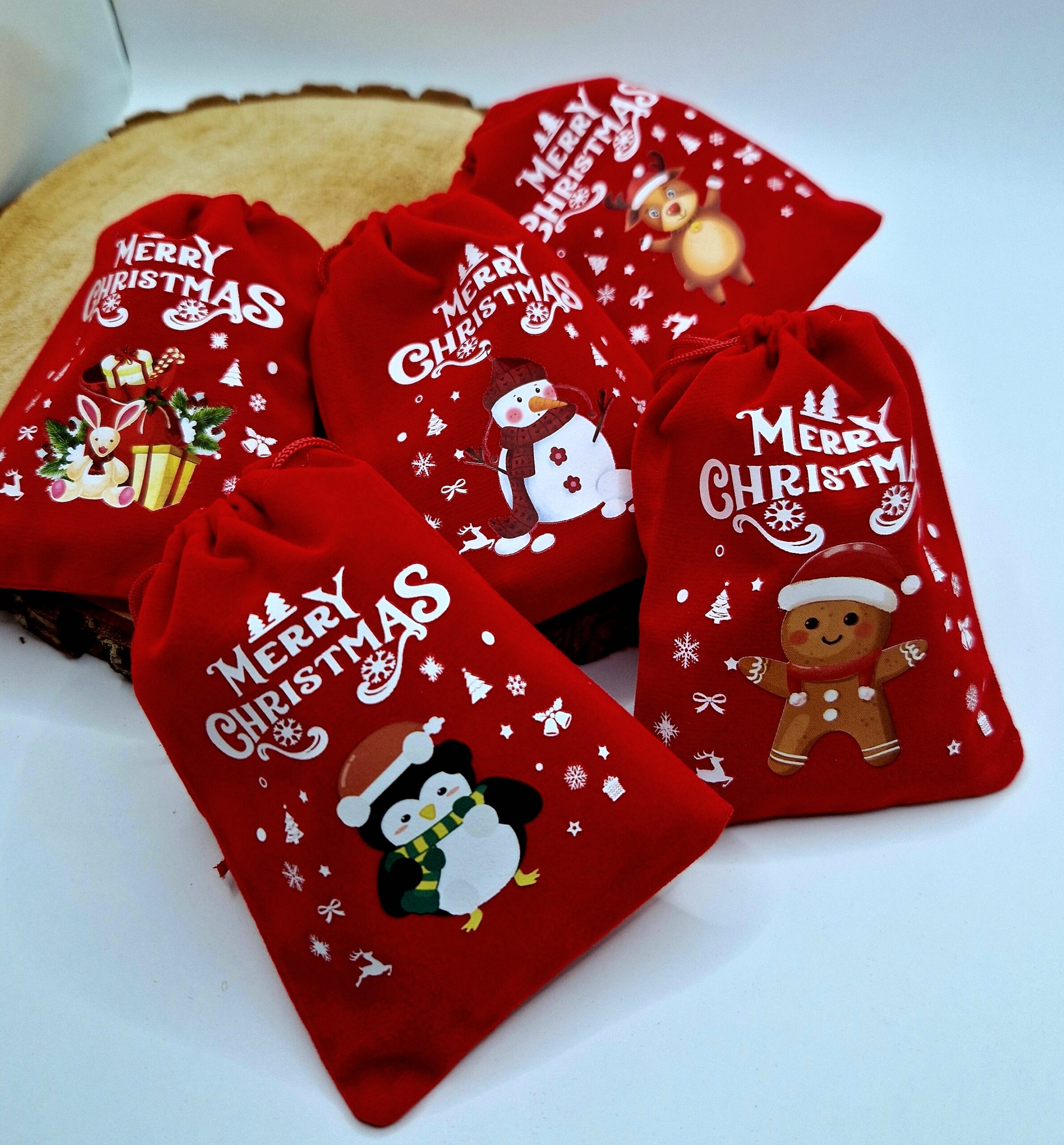 - Woreczek czerwony z wzorem świątecznym (piękny materiał zamsz/aksamit) 9x12cm x 1 sztuka
