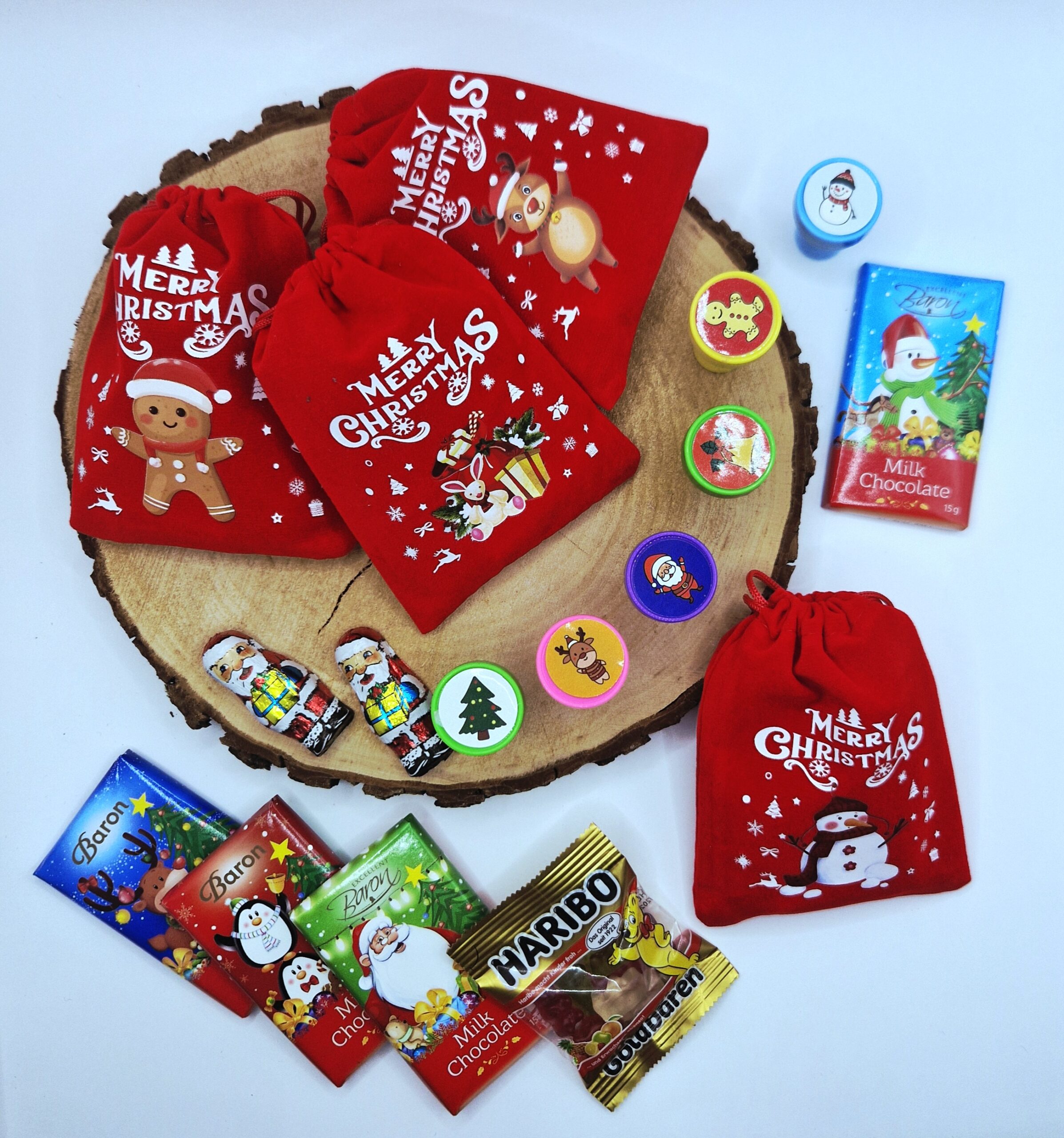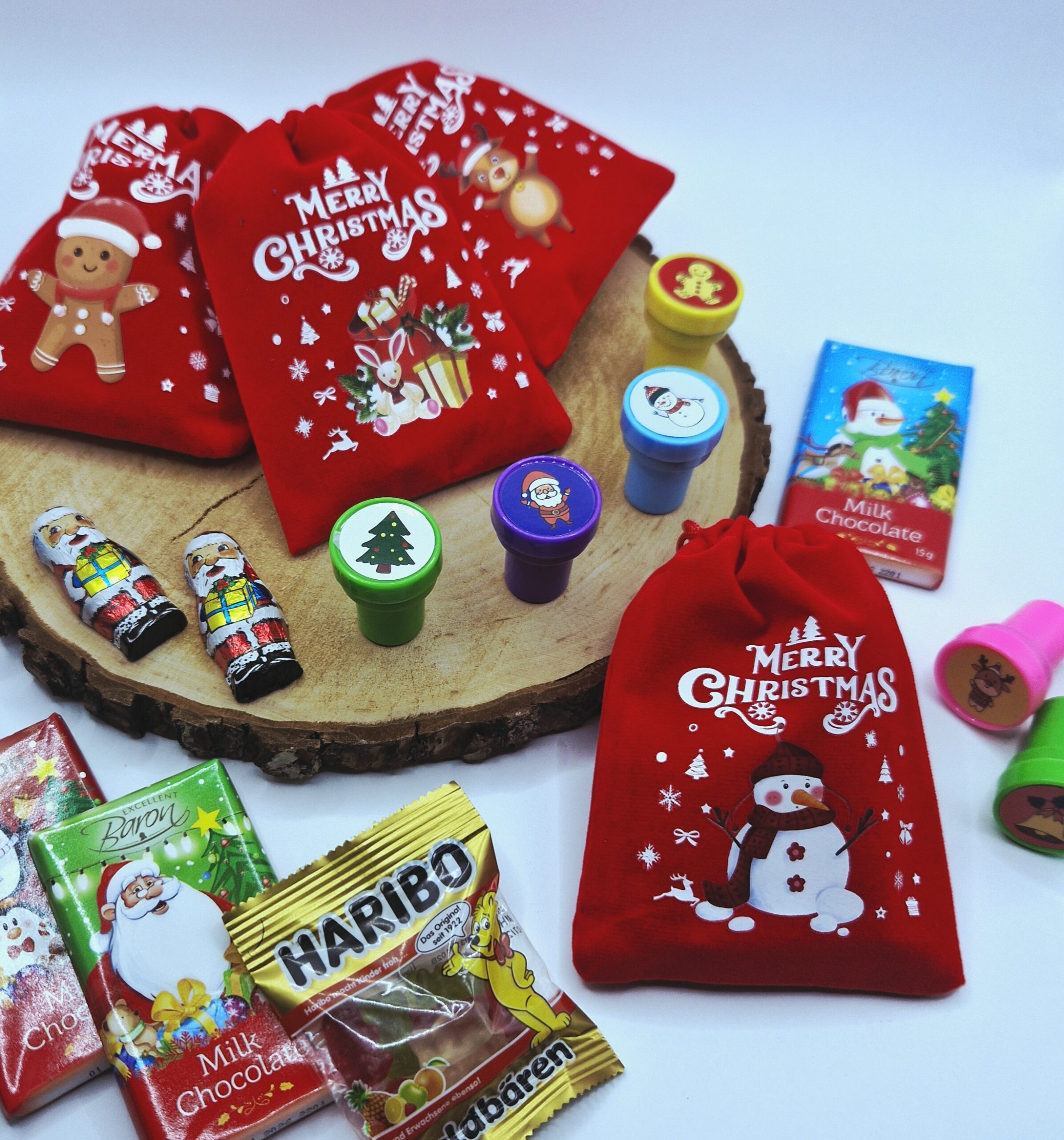 Podziękowanie upominek prezent dla dzieci do przedszkola /szkoły ( woreczki czerwone Mikołaja ze świątecznymi stempelkami) na Mikołajki Święta Wigilię